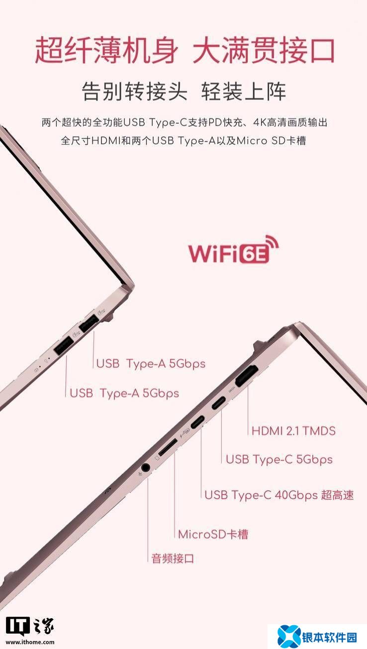 这款笔记本支持 Wi-Fi 6E 技术,其左侧配备 1 个 HDMI 2.1 接口、1 个 USB-C 5Gbps 接口、 1 个 USB-C 40Gbps 接口;1 个 MicroSD 卡槽、 1 个 3.5mm 音频接口;右侧配备 2 个 USB-A 5Gbps 接口。