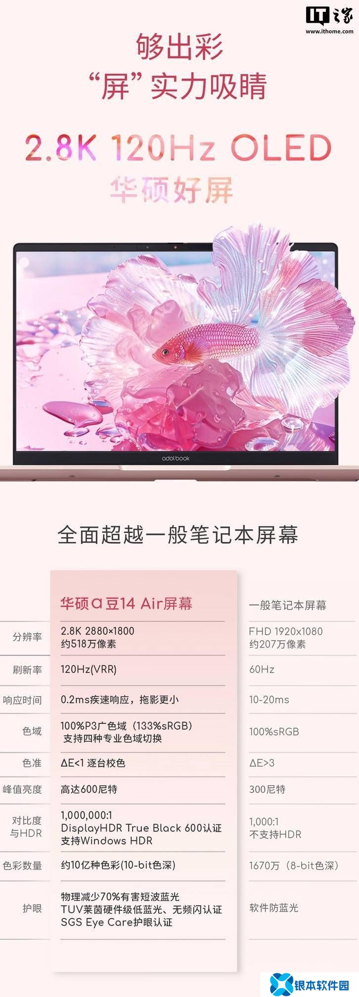 该机搭载一块 14 英寸 2880x1800 分辨率 120Hz 面板,响应速度 0.2ms,亮度 600 尼特,动态对比度 100 万:1,支持 10-Bit 色彩,覆盖 133% sRGB 色域及 100% DCI-P3 色域。