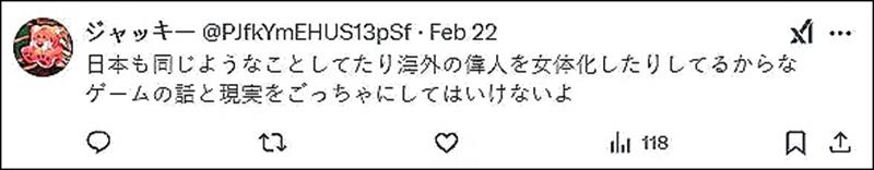 评论区有人表示:“育碧是恶意的,不尊重我们”,还有人表示:“日本不是也在做同样的事情吗?把海外名人变成女性什么的,所以不要把游戏故事和现实混为一谈。”
