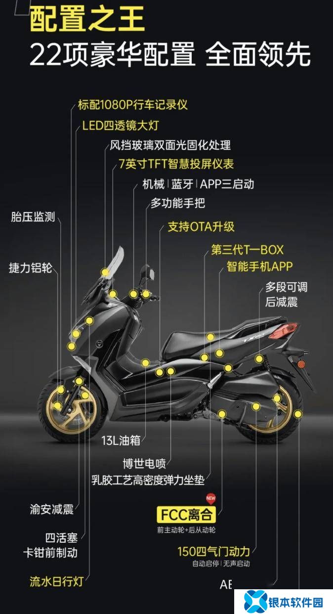 在车辆规格方面,2025款TX150的长宽高分别为1975x770x1243毫米,轴距达到1360毫米,确保了良好的操控性和乘坐舒适性。座高设定为755毫米,整备质量为150公斤。车辆配备了一系列先进的配置,包括内置行车记录仪、胎压监测系统、多段可调后减震器、四活塞前刹车系统以及双通道ABS和TCS牵引力控制系统,为骑行安全提供了全方位保障。