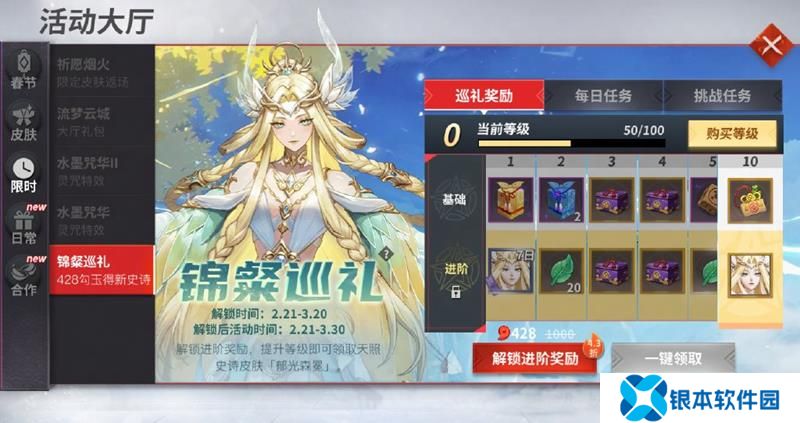活动期间通过完成任务获取经验值提升等级,即可获取免费线奖励;更可花费428勾玉解锁付费线,获得天照史诗皮肤「郁光森冕」。