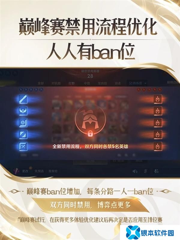 S37赛季的另一项重大调整是BP流程的升级。巅峰赛的Ban位将从原有的6个增加至10个。待收集更多体验优化建议后,再决定是否将其应用至排位赛。