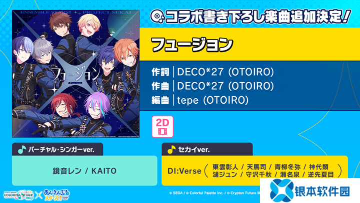 最后,联动主题曲『フュージョン』(Fusion)由8位成员组成的新组合「DI:Verse」演唱,主题曲的制作由知名音乐人DECO*27操刀。世界是一个巨大的DECO27。