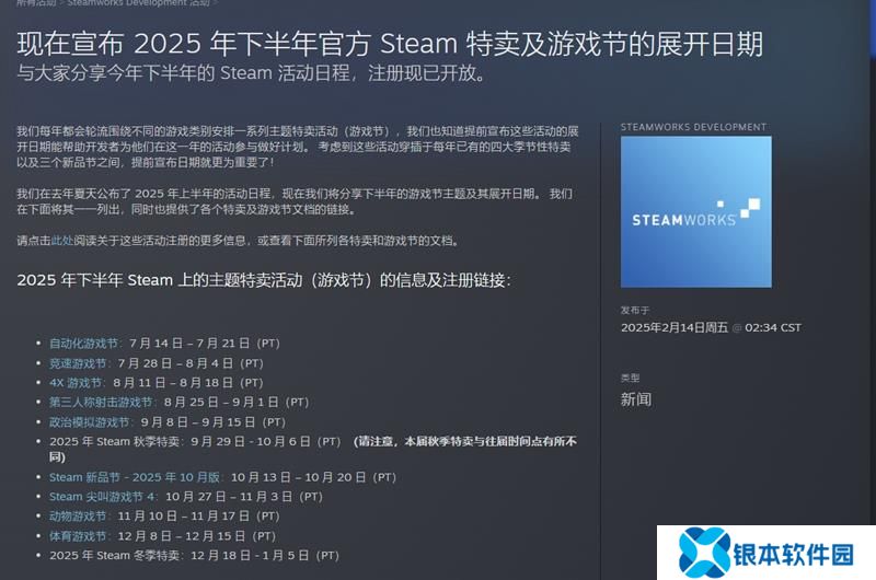 随着新一年的到来,很多小伙伴想知道Steam平台今年的特卖活动和专题游戏节安排。今日,Steam公布了其2025年内特卖及游戏节的具体安排详情(所有时间均为太平洋时间,PT)。这些活动不仅为玩家提供了以优惠价格购买心仪游戏的机会,还通过各类主题游戏节展示了不同类型的精品游戏。下面我们一起来看一看。
