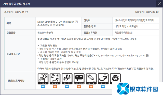 《死亡搁浅2》近日在韩国正式获得了韩国游戏分级和管理委员会(GRAC)的官方评级,并被划分为“未成年人禁止游玩”级别。这一评级迅速引发了媒体和玩家的广泛关注,成为讨论热点之一。