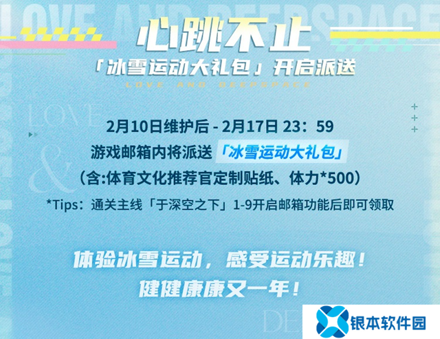 为了庆祝此次活动,游戏内还特别推出了“冰雪运动大礼包”派送活动。2月10日更新后,玩家们可以在游戏内的邮箱中查收这份特别的礼物,包括体育文化推荐官定制贴纸5和体力500。邮件有效期至2月17日23:59,玩家们只需通关主线“于深空之下”1-9即可开启邮箱功能并领取礼包。