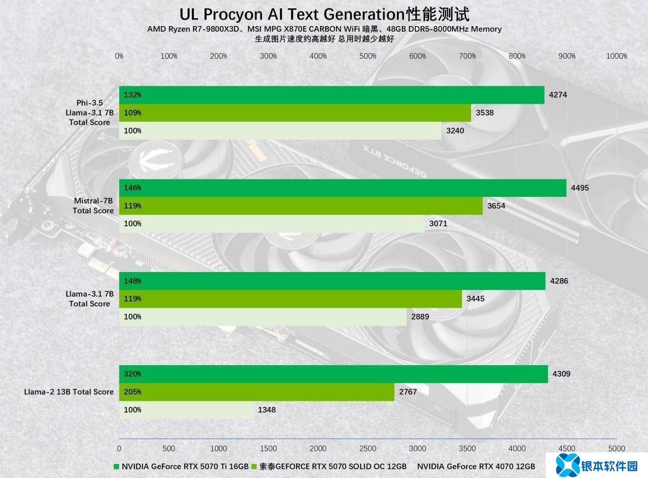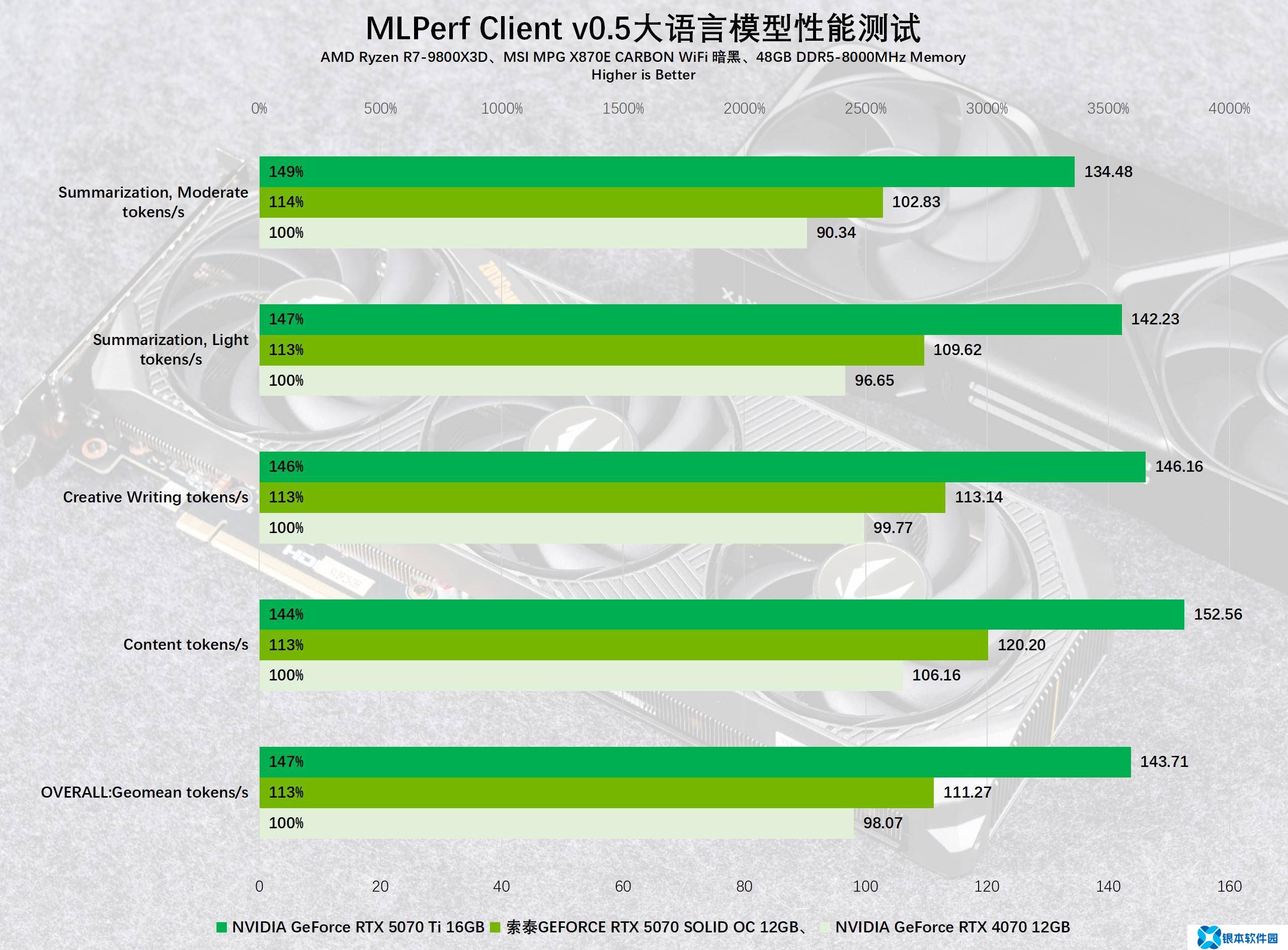在AI文本生成测试中,我们用UL Procyon与MLPerf Client v0.5分别进行大语言模型进行测试,实测索泰 RTX 5070 SOLID OC在每一项中都表现出不错的性能,各项领先幅度均在13%以上。