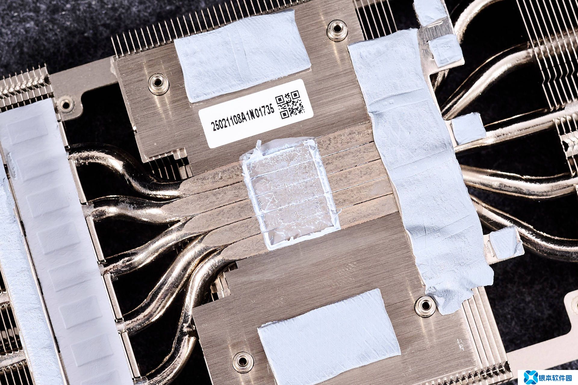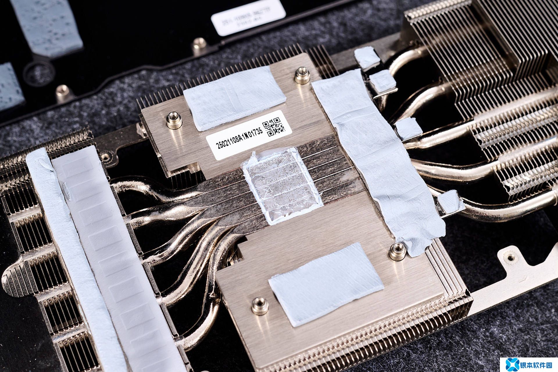 5条镀镍热管紧密覆盖在GB203核心上,减少了底座与热管之间的热阻,从而更高效地将GPU产生的热量迅速传导至热管,并最终通过散热鳍片散发至空气中。