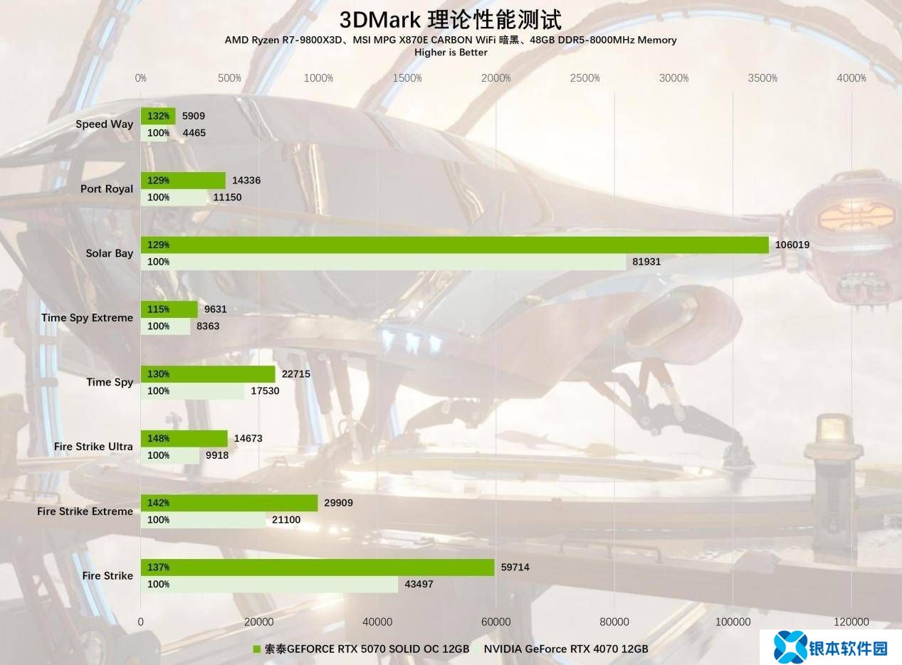 先进行的是3DMARK理论性能测试,整体来说索泰 RTX 5070 SOLID OC领先于RTX 4070约32.7%。其中在传统的FireStrike系列测试中,索泰 RTX 5070 SOLID OC性能提升幅度很大,平均领先上代RTX 4070能达到40%;其中DX12的Time Spy系列测试中,索泰 RTX 5070 SOLID OC同样有着22%的领先幅度。