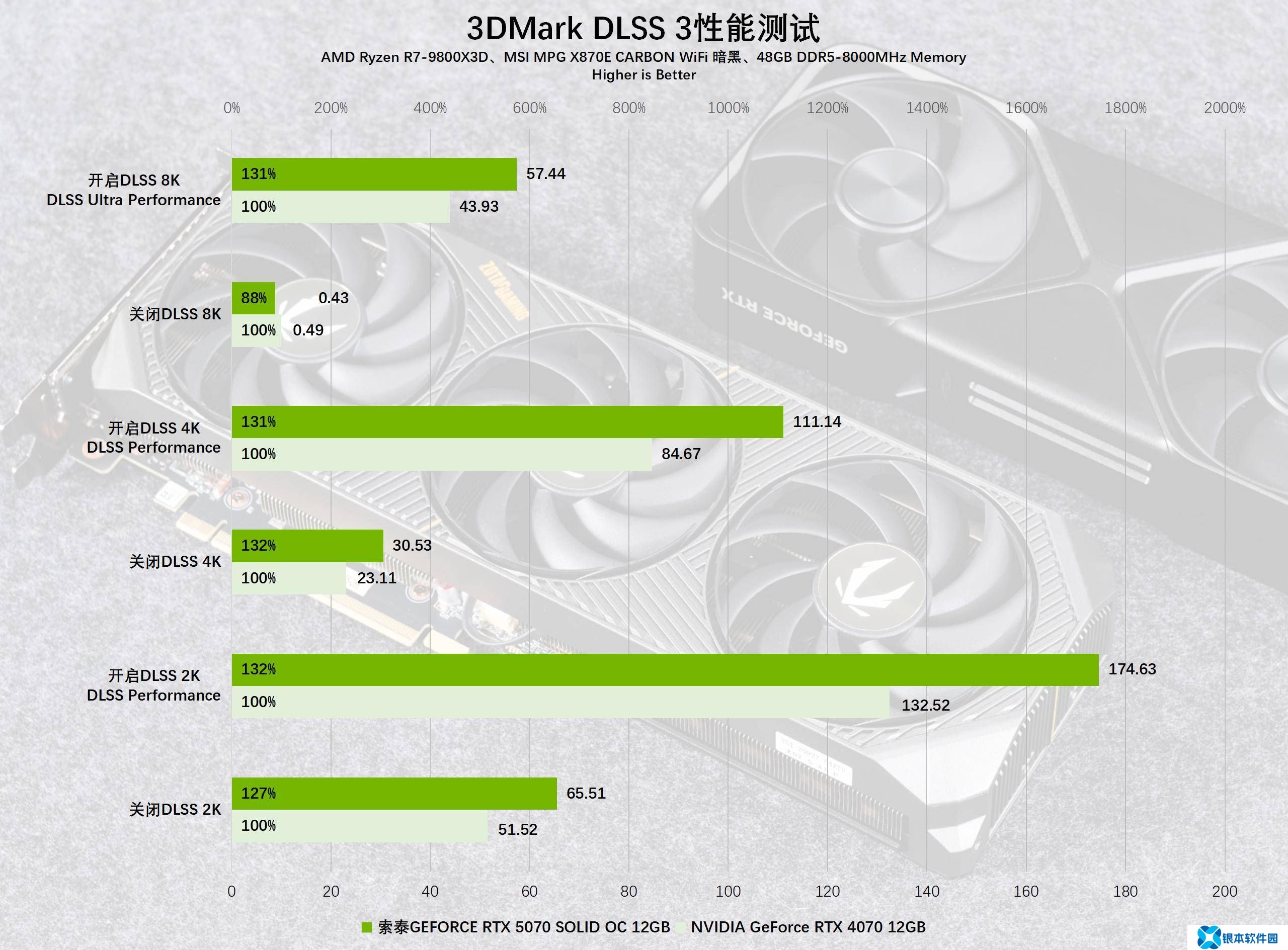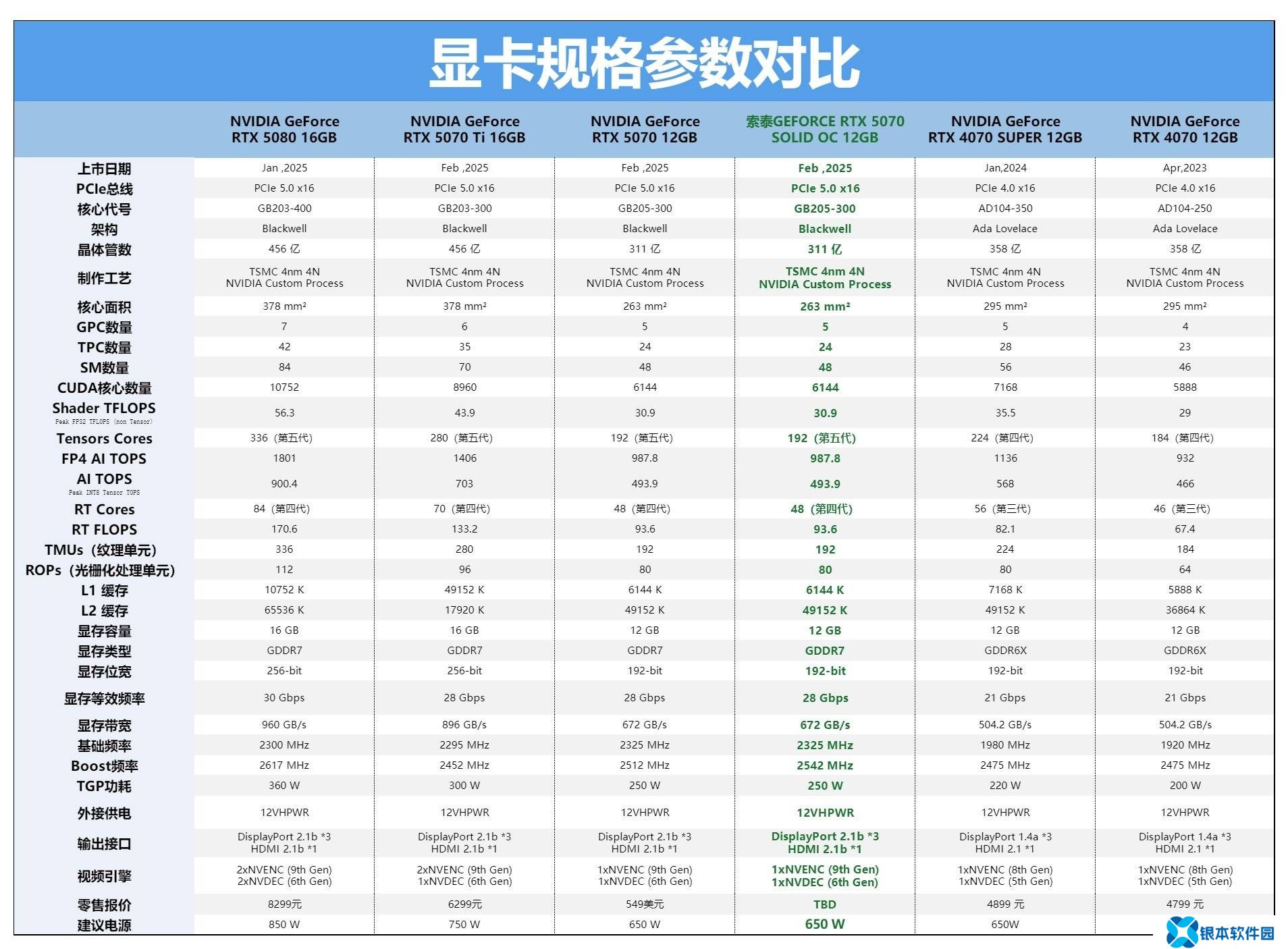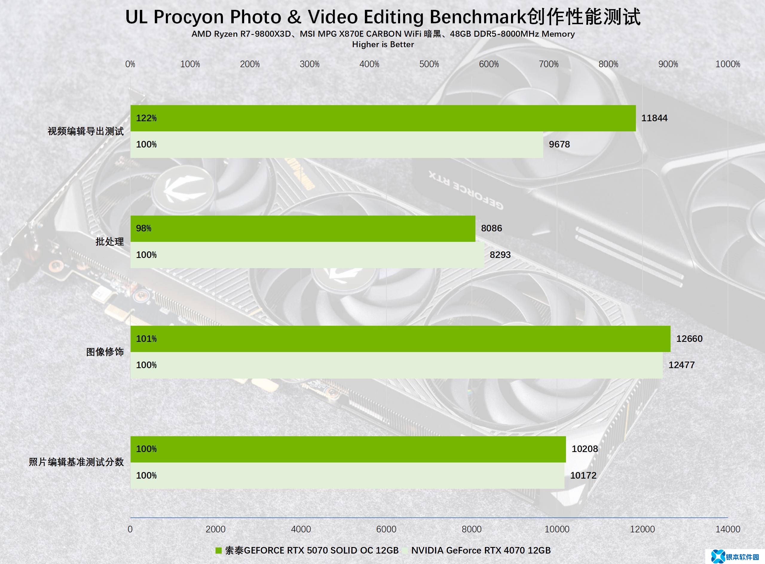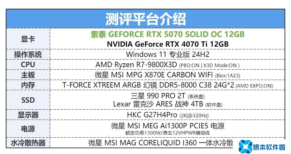 至于对标显卡方面,我们这次拿NVIDIA上代RTX 4070显卡与索泰 RTX 5070 SOLID OC进行性能对比,分别对理论性能、游戏性能、DLSS性能、创作能力、AI性能,以及功耗等不同维度的表现。