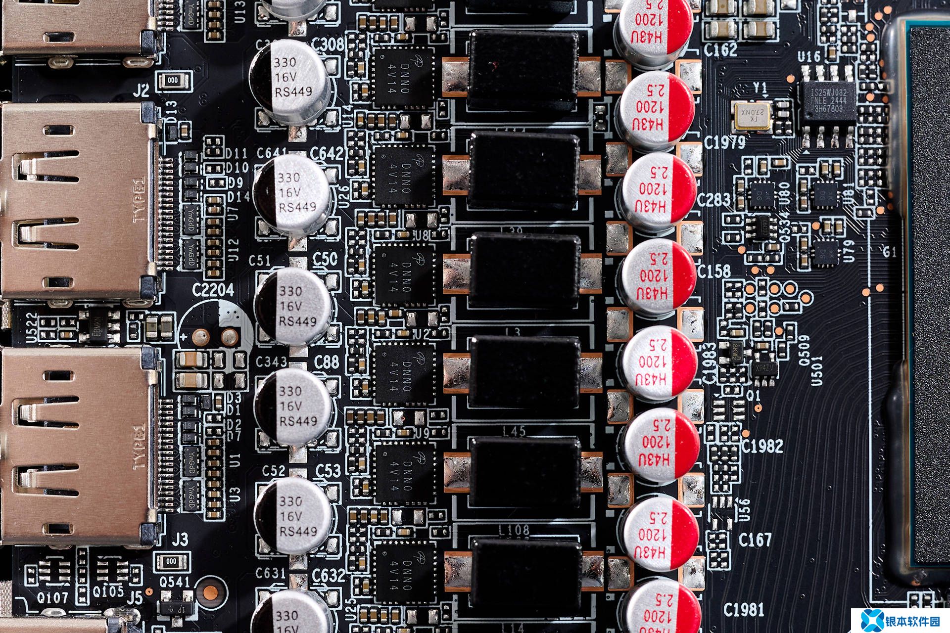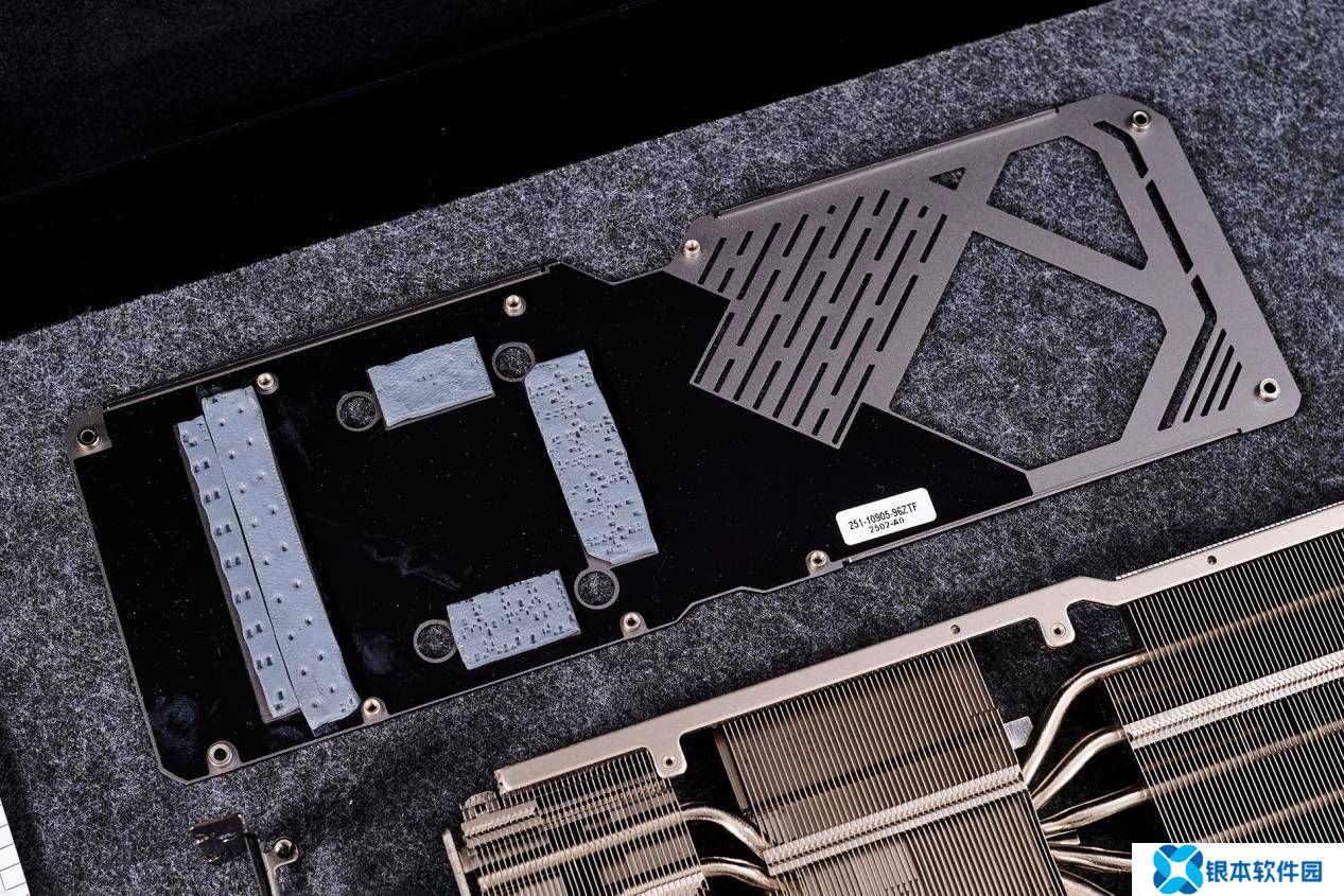 金属背板黑色贴纸为防短路贴纸,保护电子元件免遭短路损害;同时,供电和显存PCB的背面也配备了导热垫以辅助散热。