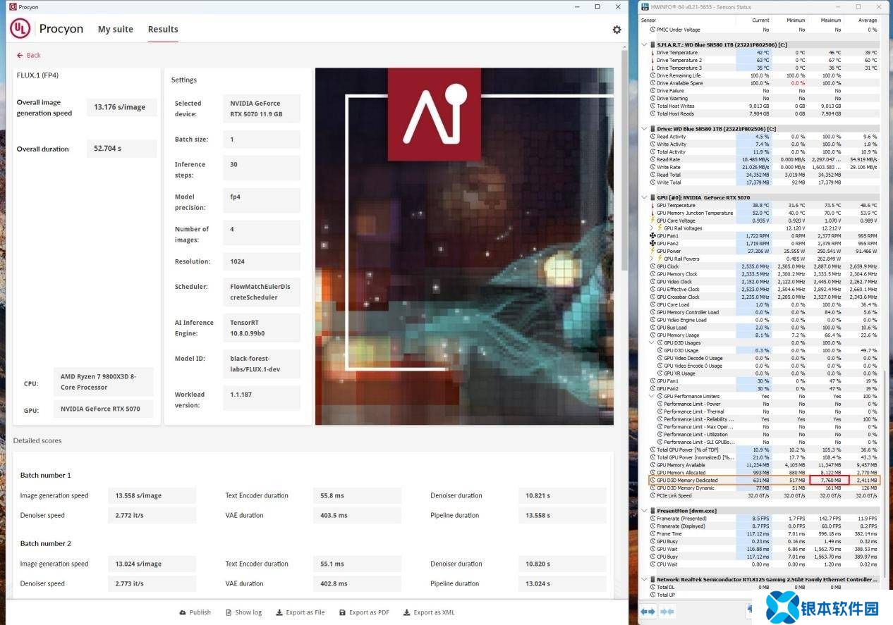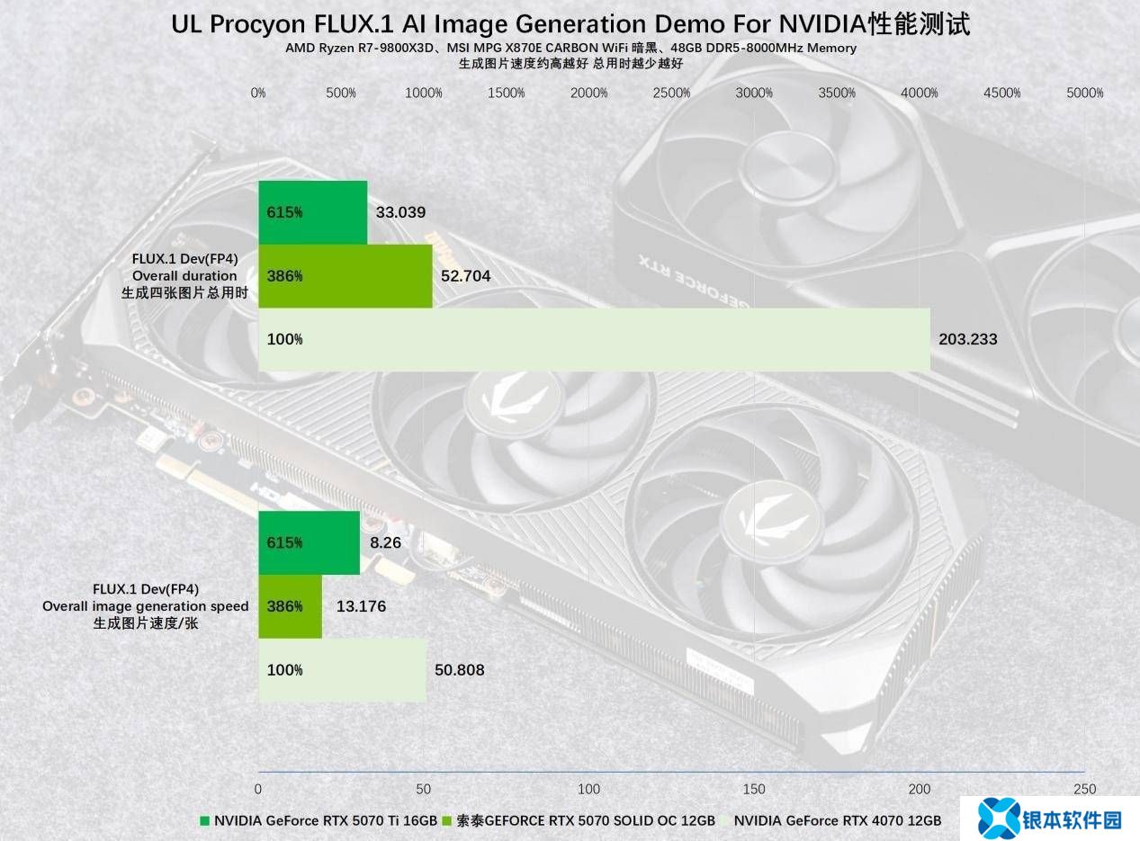 利用UL Procyon测试版本FLUX.1 AI Image Generation Demo For NVIDIA进行测试。为何不用FP8精度模型时,因为两款显卡同样存在爆显存的情况,因此此项测试中仅为FP4精度模型。索泰 RTX 5070 SOLID OC生成图片的速度能够提升到13.176秒一张,效率同样是翻了几番。