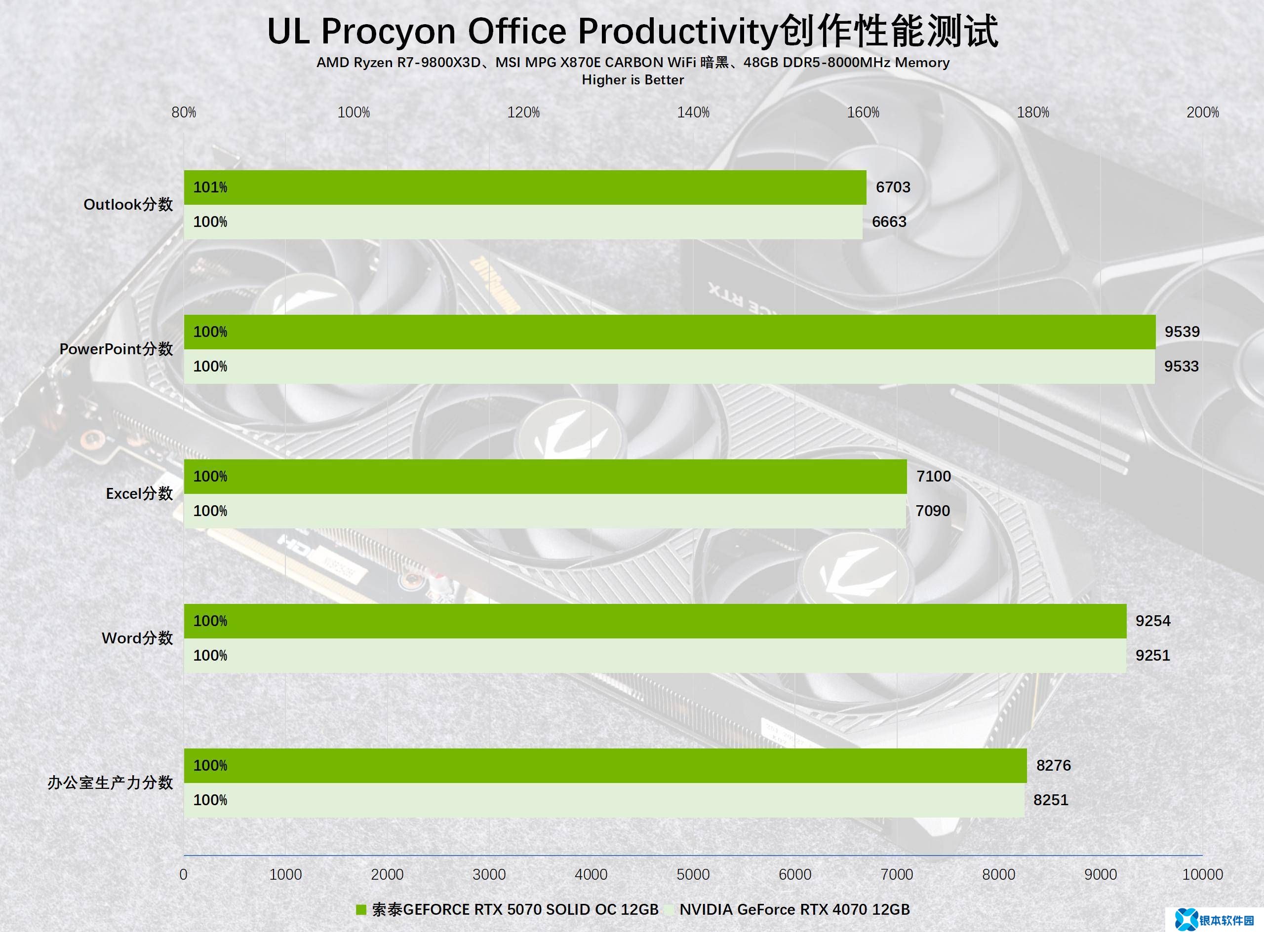 在办公软件的测试环节中,索泰 RTX 5070 SOLID OC与RTX 4070相差不大。实际上,使用这种级别的显卡,用户通常不会过分关注其在办公软件中的运行速度,因为日常办公软件的应用负载相对较轻。
