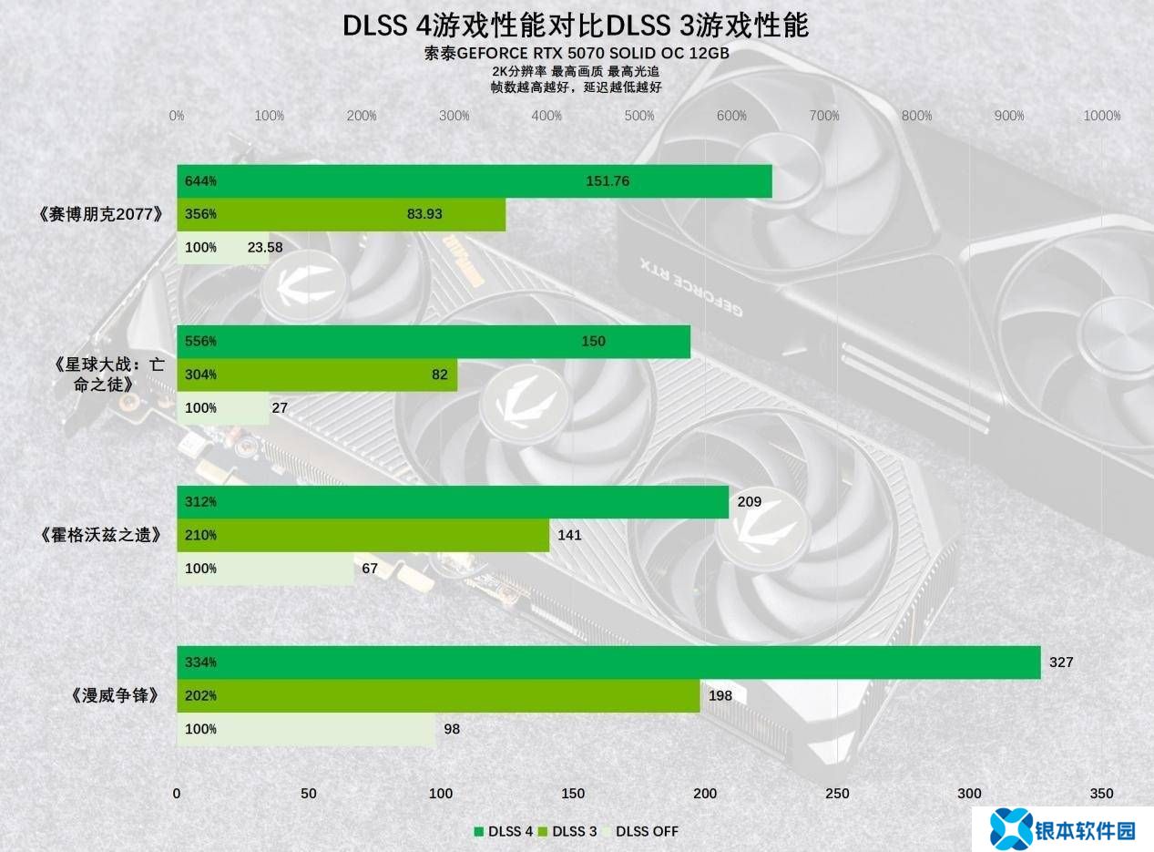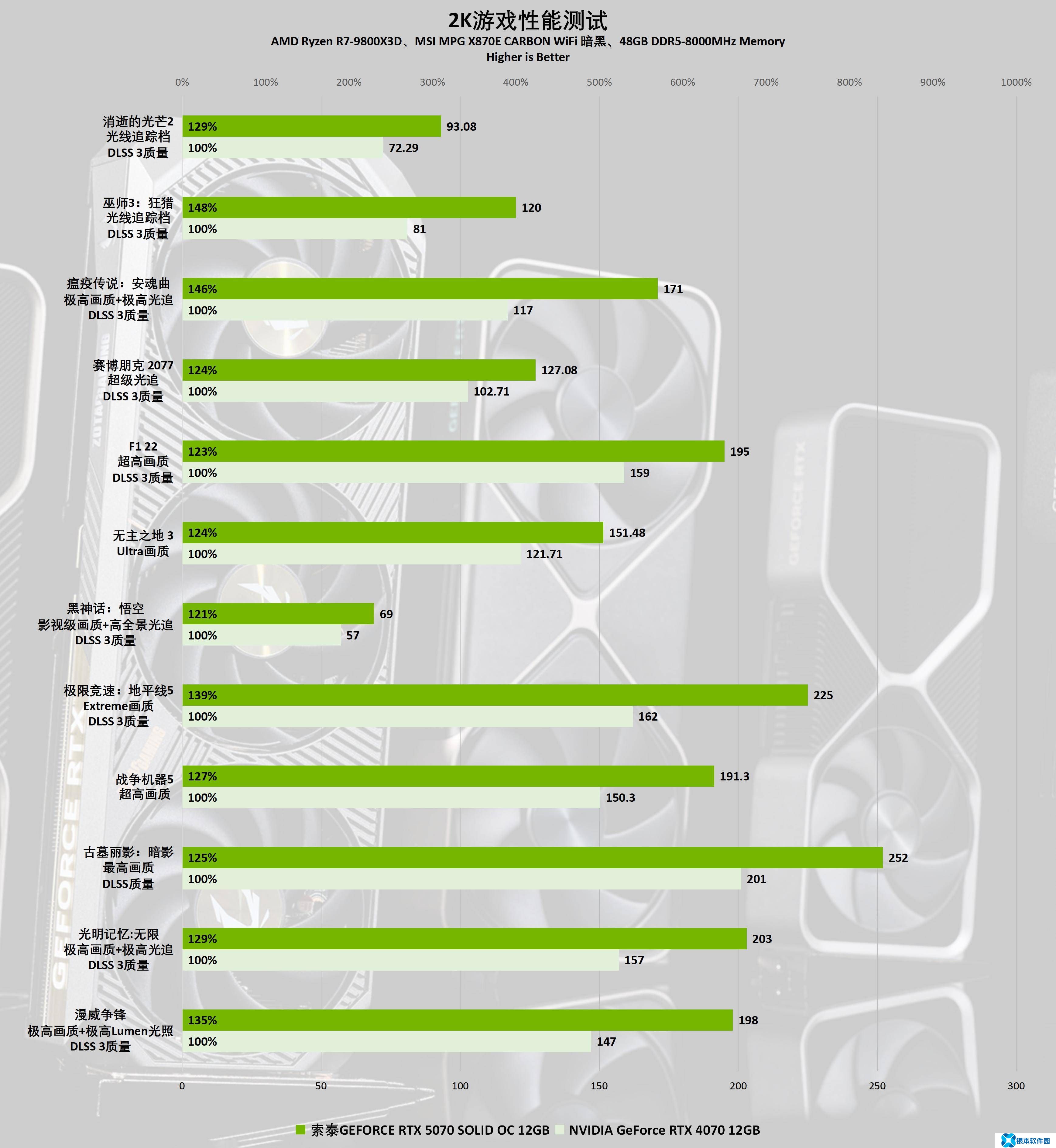 实测2K分辨率下,索泰 RTX 5070 SOLID OC应对绝大多数游戏同样是相当轻松。特别是在DLSS的加持下,满足2K@160Hz电竞级是完全没有问题。当然若是你喜欢游戏设置中开全高设置+全景光线追踪,如《黑神话:悟空》这类型对显卡要求较高的,那游戏流畅度肯定 不会太高,但是可以恰当的降低一下游戏设置,或者是把DLSS模式开到性能模式来玩,这样就可以获得更游戏的游戏体验。但不得不说的是,后续当《黑神话:悟空》也完全能够使用上DLSS 4后,想必帧数提升会更加迅猛。具体到性能上,在11款游戏中,索泰 RTX 5070 SOLID OC整体比上代RTX 4070强约30%左右,性能提升足够明显。