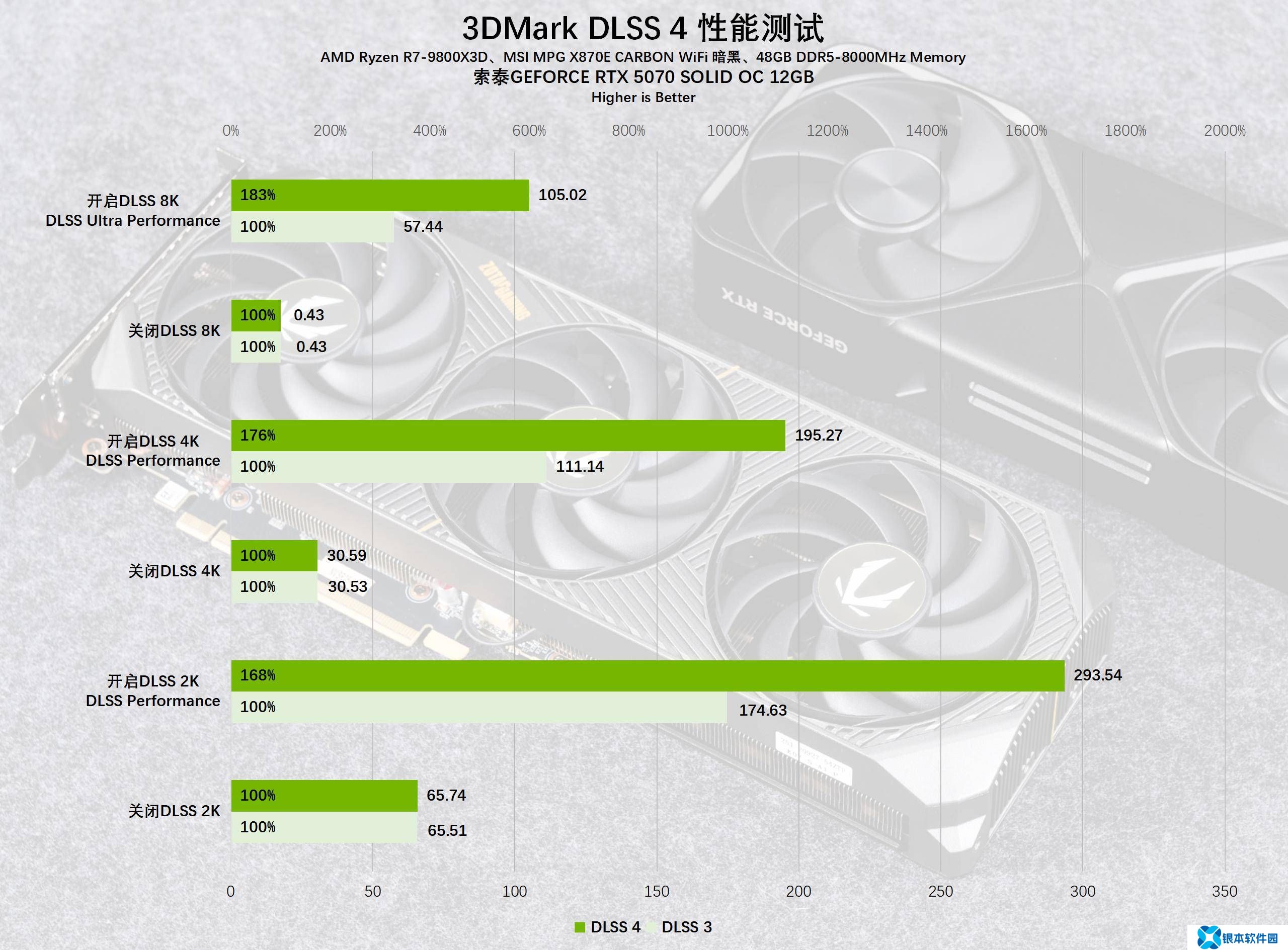 接下来是3DMARK DLSS3性能测试环节:索泰 RTX 5070 SOLID OC的表现与刚才的3DMARK理论性能测试同样突出。在DLSS 3技术加持下,索泰 RTX 5070 SOLID OC无论是2K分辨还是4K分辨率下,DEMO流畅度都有着较高的水平,尤其是4K分辨下的帧数更是达到了111.14 FPS。