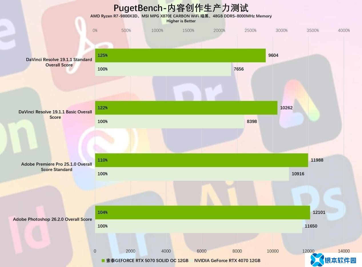 在进行平面设计和视频测试时,我们对UL Procyon和PugetBench这两个不同的基准测试工具进行了评估,得出的结果大致相同。索泰 RTX 5070 SOLID OC在视频基准测试中的表现令人瞩目,这主要归功于新一代GeForce RTX 5070编码器的进一步优化。因此,在达芬奇和Premiere Pro的测试中,索泰 RTX 5070 SOLID OC相较于前一代的RTX 4070,性能领先约10%至25%,这一差距是相当显著的。