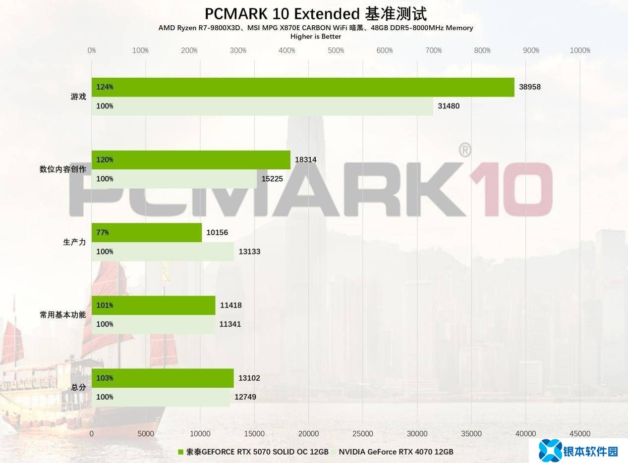 游戏性能表现已经结束了,接下来让我们看创作者们所关心的生产力性能。在PCMark10 Extended测试中,索泰 RTX 5070 SOLID OC在游戏和数字内容创作方面的表现尤为出色,相较于RTX 4070,其性能提升了大约24%和20%。然而,在生产力测试方面,其得分低于预期,这可能是因为当前驱动程序和软件优化尚未达到最佳状态。