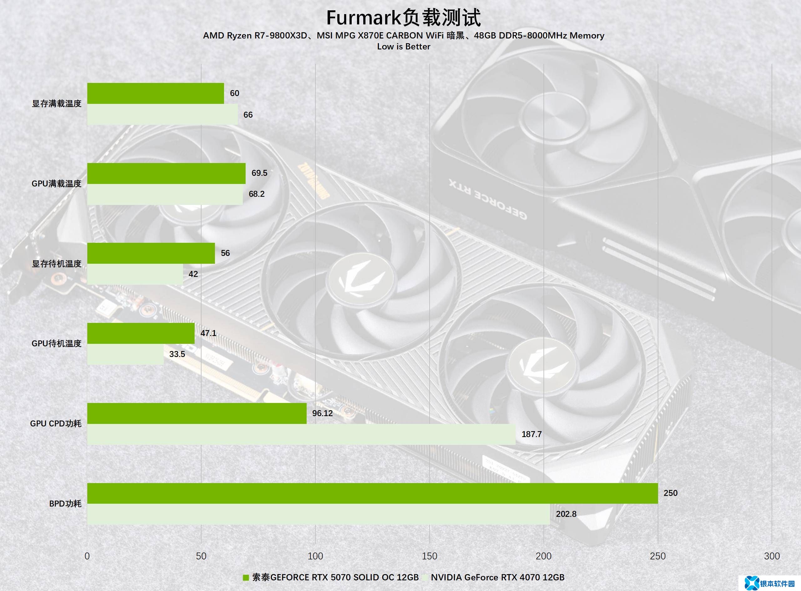 在与RTX 4070 FE显卡的温度与功耗对比中,索泰 RTX 5070 SOLID OC在满载状态下的温度表现相当出色,即便是高频的GDDR7显存颗粒的温度也得到了良好的控制。特别是显卡风扇在低温环境下几乎完全停止运转,结合之前提到的在高负载下的低噪音表现,这款显卡在温度和噪音控制方面确实做得相当优秀。
