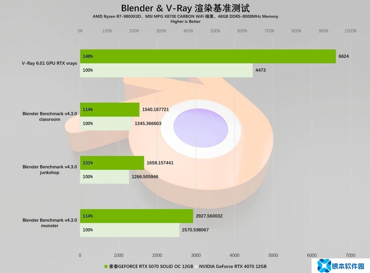 我们把目光投向3D渲染以及工业领域的软件中,看看RTX 50系显卡又有怎样的精彩表现。还是熟悉的朋友Blender以及V-Ray,在这两款软件中,索泰 RTX 5070 SOLID OC的表现也是大杀四方,基本是大幅度领先RTX 4070。