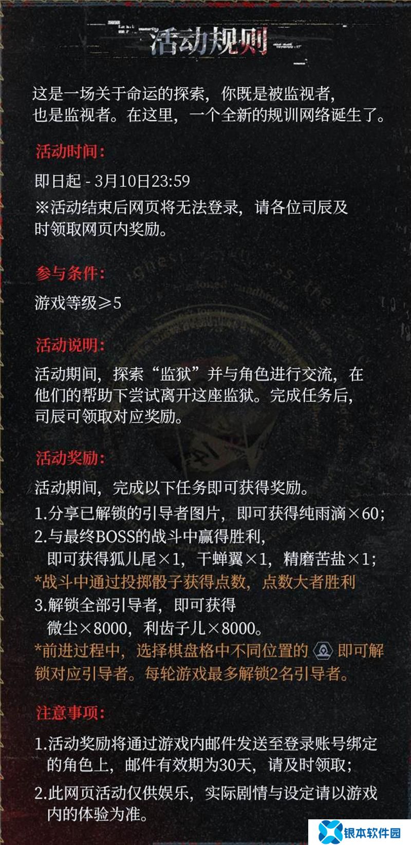 活动期间,探索“**”并与角色进行交流,在他们的帮助下尝试离开这座**。完成任务后即可领取对应奖励,详情请前往活动页内查看。此网页活动仅供娱乐,实际剧情与设定请以游戏内的体验为准。