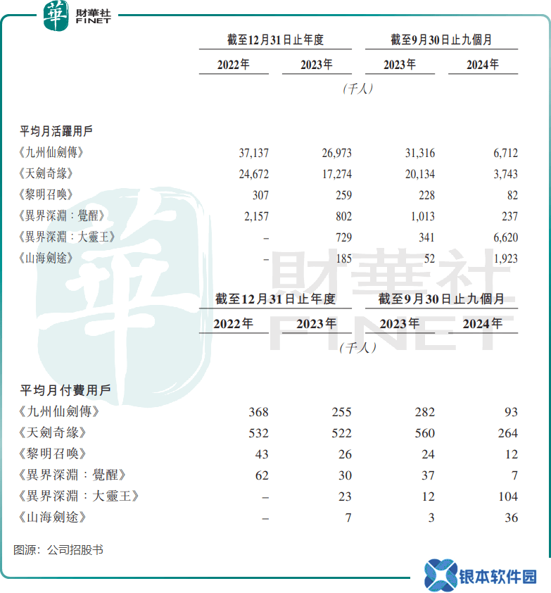 于2023年前三季及2024年前三季,《九州仙剑传》的流水分别为20.07亿元及5.38亿元,降幅高达73.2%;平均月活跃用户分别为3131.6万人及671.2万人,平均月付费用户分别为28.2万人及9.3万人,同样崩塌式下滑。