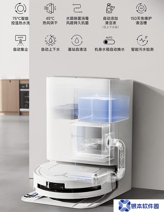 75℃智能控温热水洗拖布、99.99%风路抗菌、45℃热风烘干,搭配自动上下水模块,实现“150天免维护”,全面解放双手。