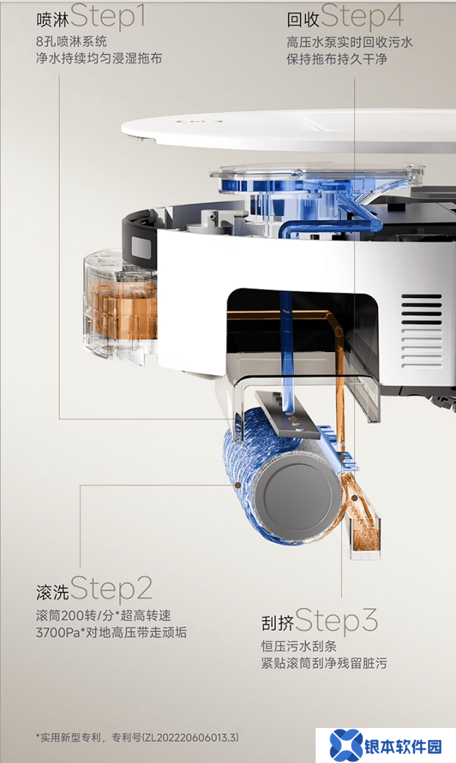 ● 动态活水系统:清水箱实时喷淋净水,恒压刮条刮除污水,避免传统拖地机“以脏拖脏”的二次污染