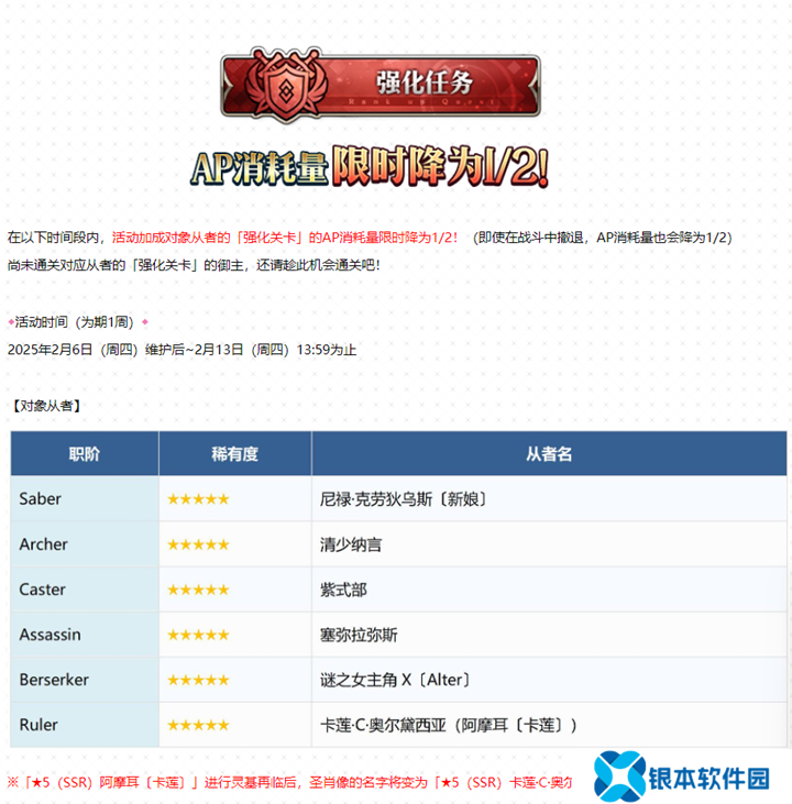 此外,活动期间还将为玩家带来额外福利。在2025年2月6日(周四)维护后至2月13日(周四)13:59,活动加成对象从者的「幕间物语」的AP消耗量将限时降为1/2,即使在战斗中撤退,AP消耗量也会降为1/2。这为尚未通关对应从者的「幕间物语」的御主提供了绝佳机会,可以趁此机会轻松完成通关。同时,在同一时间段内,活动加成对象从者的「强化关卡」的AP消耗量也将限时降为1/2,为玩家提供了强化从者的机会。