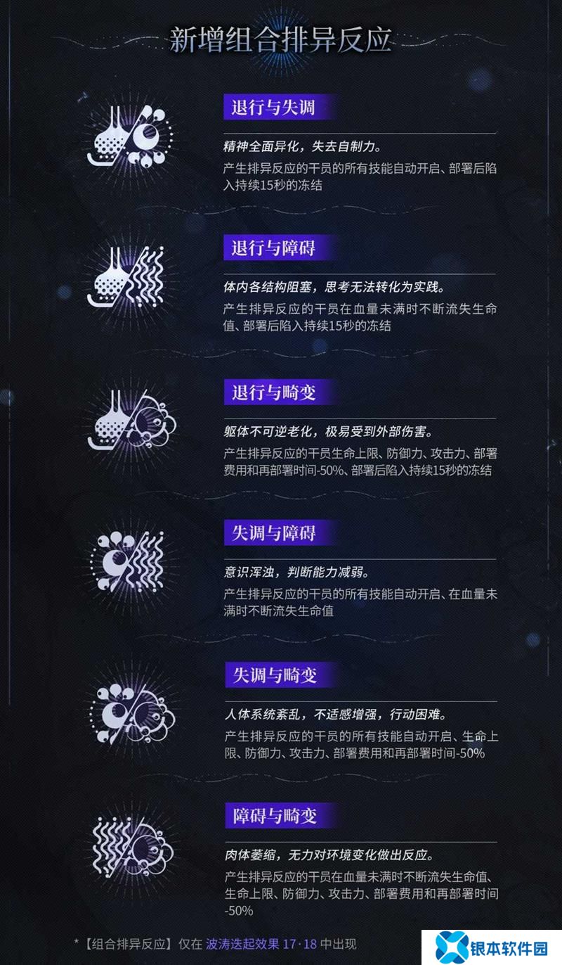 退行与畸变:躯体不可逆老化,极易受到外部伤害。产生排异反应的干员生命上限、防御力、攻击力、部署费用和再部署时间-50%,部署后陷入持续15秒的冻结。