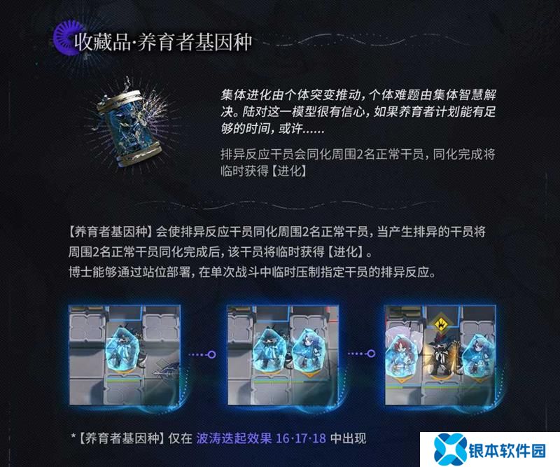 收藏品·养育者基因种:排异反应干员会同化周围2名正常干员,当产生排异的干员将周围2名正常干员同化完成后,该干员将临时获得【进化】。