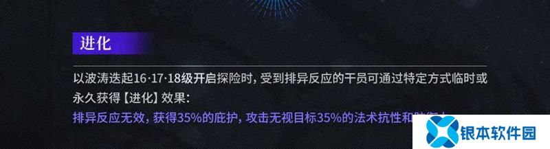 进化:以波涛迭起16·17·18级开启探险时,受到排异反应的干员可通过特定方式临时或永久获得【进化】效果。