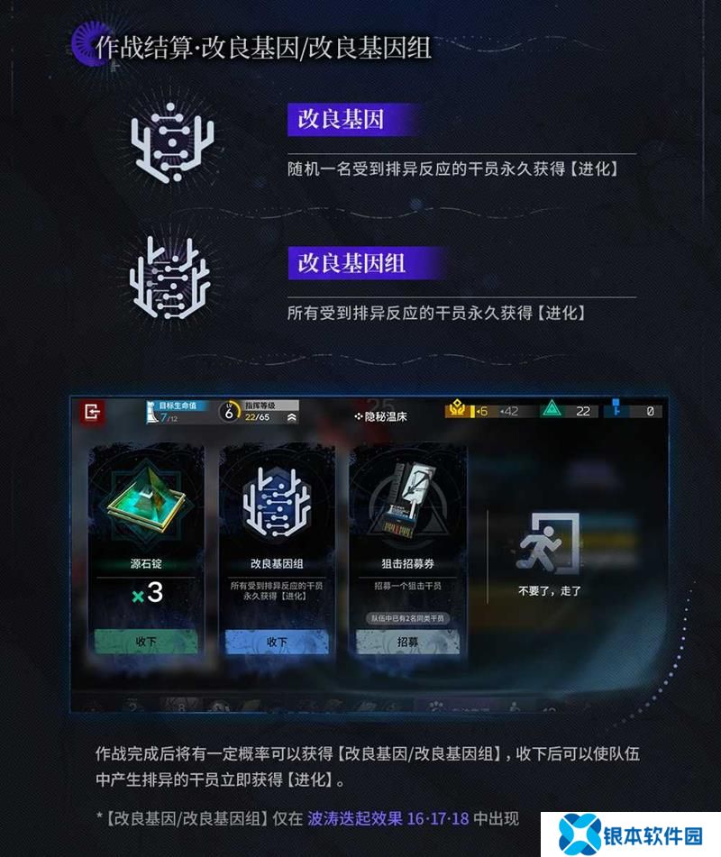 作战完成后将有一定概率可以获得【改良基因/改良基因组】,收下后可以使队伍中产生排异的干员立即获得【进化】。