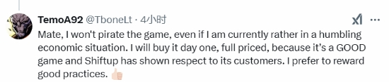 “兄弟,虽然我现在手头很紧,但我不会玩盗版。我会买首发,全价,因为这是一个好游戏,Shiftup非常尊重玩家。我会选择支持它。”