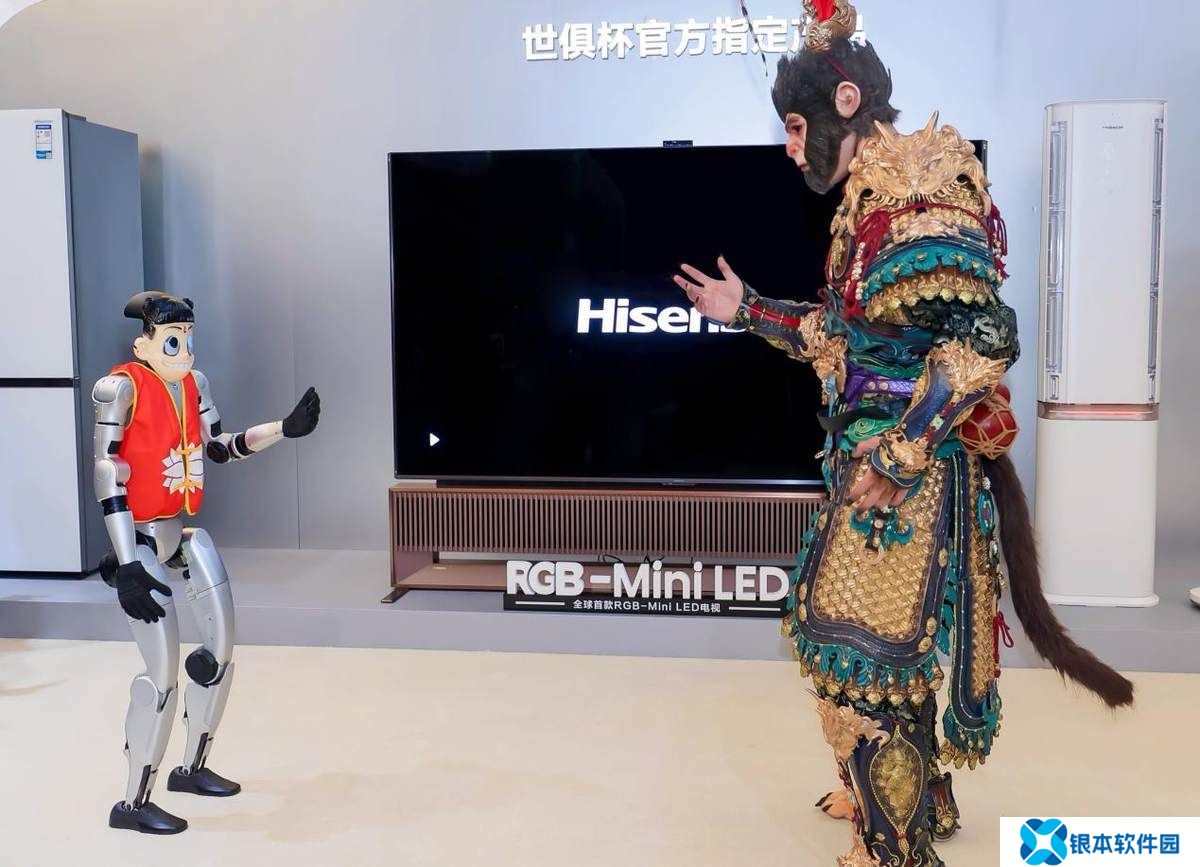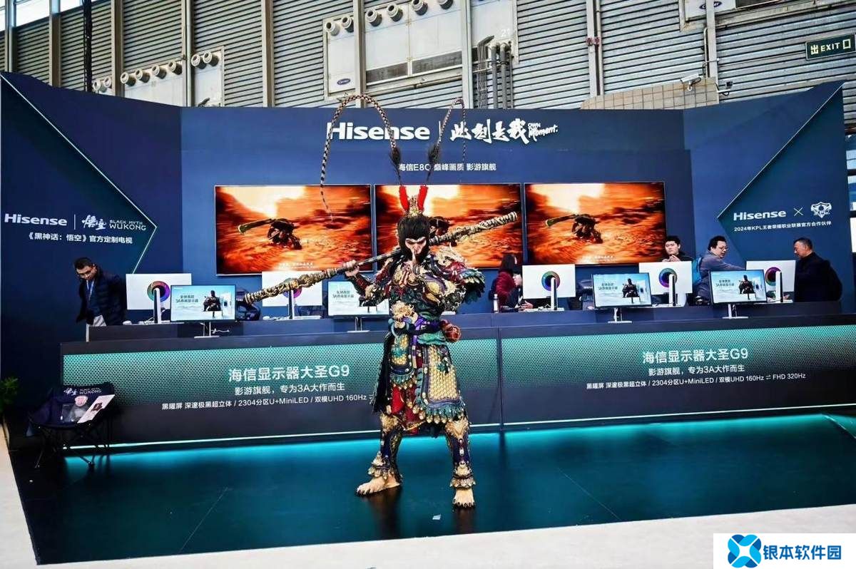 在展区的另一侧,海信电视还展示了其四路投屏的强大功能。4台100吋E8Q Pro共同展示的《黑神话:悟空》游戏画面,不仅暗场细腻有层次,对战画面也丝滑流畅。这得益于信芯AI画质芯片H7的精准色彩管理,让满屏的中式美学风更加引人入胜。