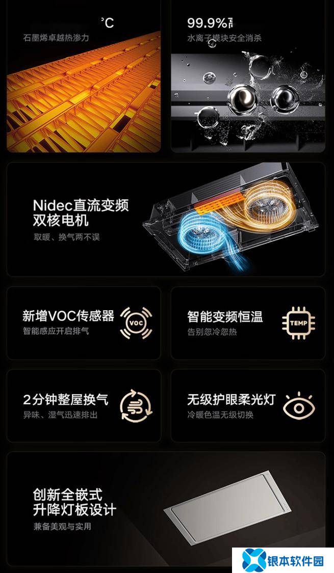 在加热技术方面,这款浴霸采用了石墨烯速热科技,据称能在1分钟内将室温提升15℃。同时,浴霸还支持变频式恒温、摆动送风和立体循环加热功能,确保浴室温度均匀且稳定。