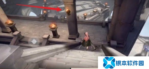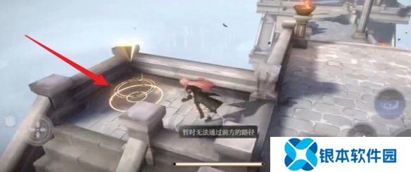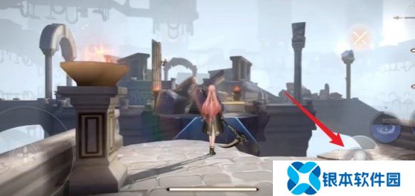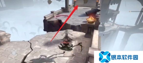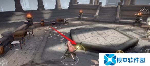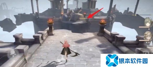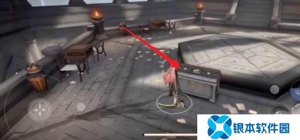3、站在图中的位置,点击箭头处的技能,注意调整好位置,即可过去开启宝箱。