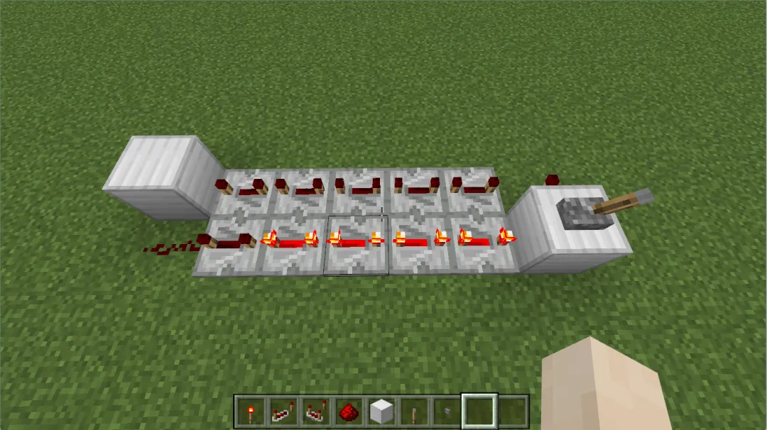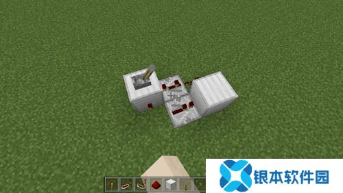 将2个红石中继器的箭头分别朝向2个铁块,在其中1个铁块上放置拉杆,并在侧面插上红石火把。