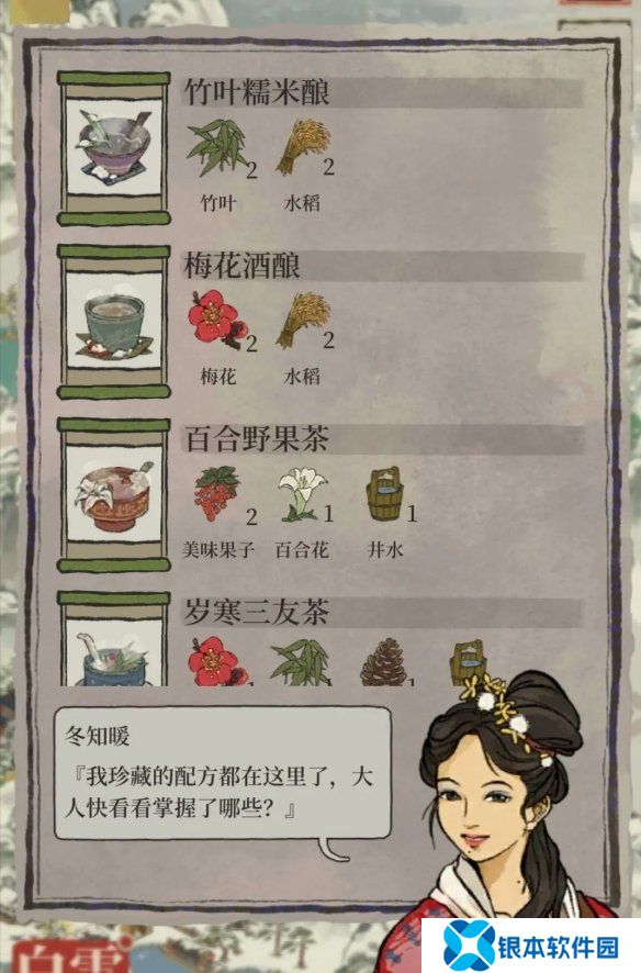 配方:梅花1朵、美味果子3个、桃花1朵、百合花1朵,以及苏州府桃花坞的井水1桶。