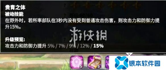 在野外时,若所率部队在3秒内没有受到普通攻击伤害,则攻击力和防御力提升15%。