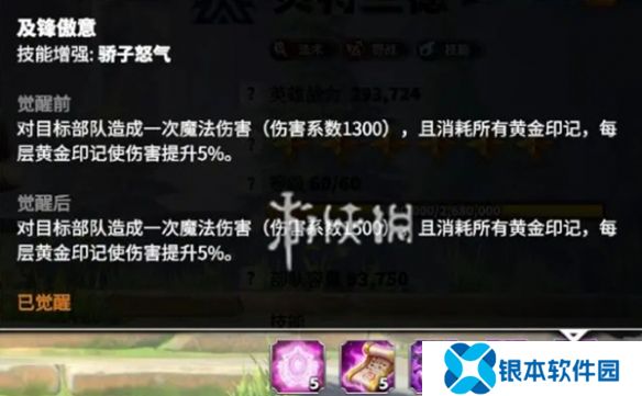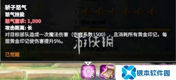 觉醒后:对目标部队造成一次魔法伤害(伤害系数1500),且消耗所有黄金印记,每层黄金印记使伤害提升5%。