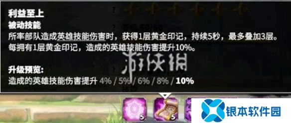 所率部队造成英雄技能伤害时,获得1层黄金印记,持续5秒,最多叠加3层。每拥有1层黄金印记,造成的英雄技能伤害提升10%。