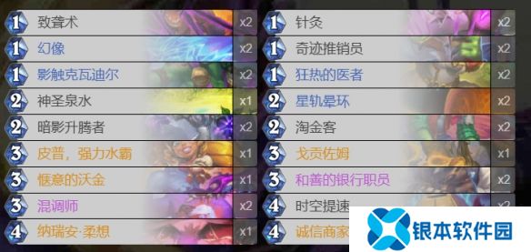 构筑方面,套牌中带了相当多的直伤如针灸,时空提速+幻象,而毒奶体系的加入让狂热的医者奶6和神圣的泉水也成为了相当高效的直伤。目前主流职业不少是没有回复能力的,因此这些直伤相当致命。但泉水因为在没有113毒奶的情况下会卡手因此只带一张。