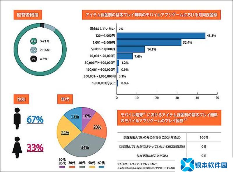 调查结果显示,氪金玩家主要分为三个层次:低热层占比89.5%,每月氪金金额不高于1万日元;中坚层占比7.5%,氪金金额在1万至5万日元之间;而最核心的玩家群体占比3%,氪金金额超过5万日元。从性别和年龄分布来看,男性玩家在氪金群体中占比67%,远多于女性玩家,且年龄分布较为均匀,其中40至49岁年龄段的玩家占比最高,达到34%。