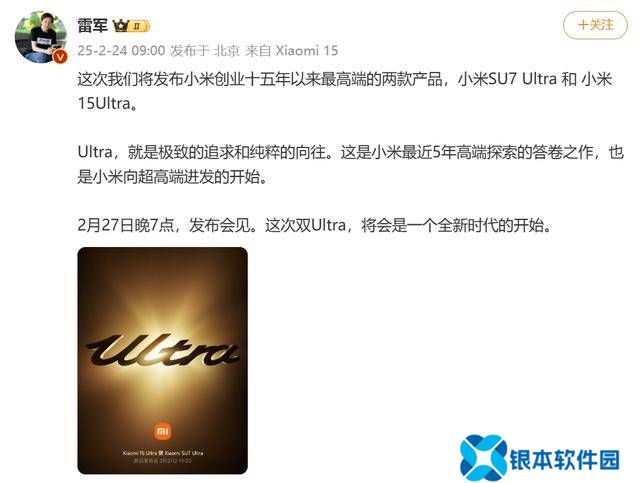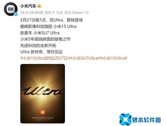 随后,小米汽车官方微博也确认了这一消息,并宣布了具体的发布时间:2月27日晚上7点,小米SU7 Ultra与小米15 Ultra将正式亮相。这一消息引发了众多米粉和科技爱好者的热烈讨论和期待。